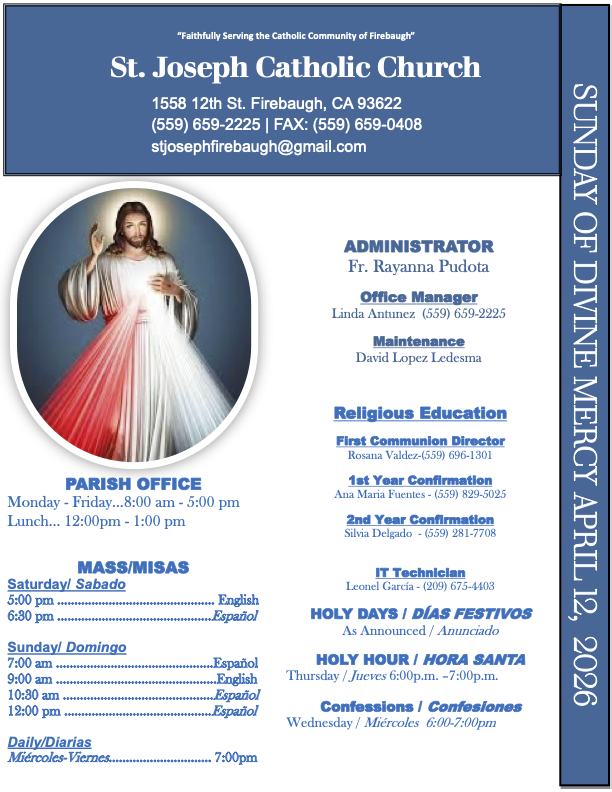 Church Bulletin 04/12/2026 - Divine Mercy Sunday 02/22/2026 - First Sunday of Lent 03/01/2026 - Second Sunday of Lent 03/08/2026 - Third Sunday of Lent 03/15/2026 - Fourth Sunday of Lent 03/22/2026 - Fifth Sunday of Lent 03/29/2026 - Palm Sunday 04/05/2026 - Easter Sunday 04/12/2026 - Divine Mercy Sunday 04/19/2026 - Third Sunday of Easter 04/26/2026 - Forth Sunday of Easter 05/03/2026 - Fifth Sunday of Easter